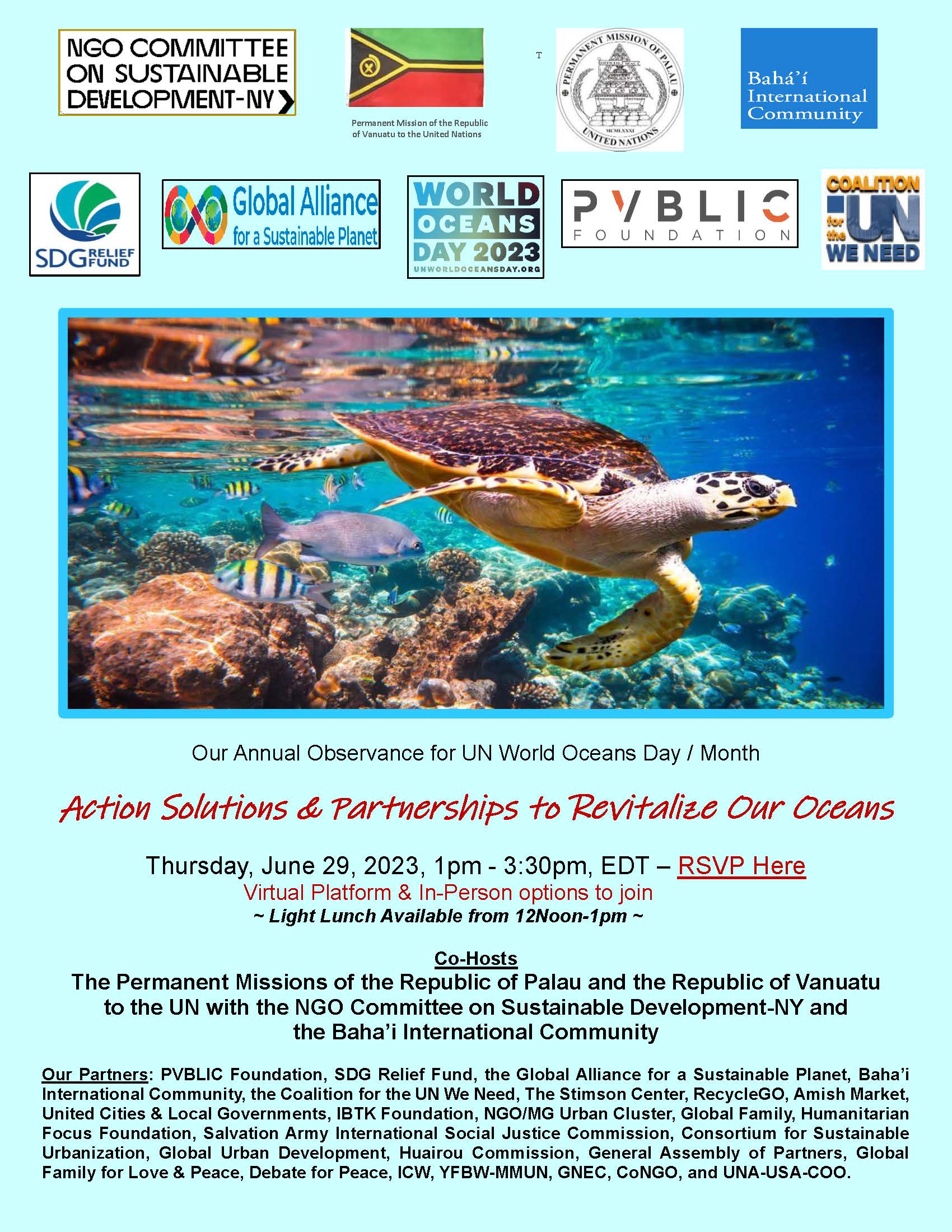 Our annual observance for UN World Oceans Day / Month this year will include a panel of experts with their innovative initiatives for revitalizing our Oceans. Together, we are engaging stakeholders from various sectors to develop sustainable action solutions and partnerships for the UN 17 SDGs. Building on the momentum generated by the successful negotiations of the UN Intergovernmental Conference on Marine Biodiversity of Areas Beyond National Jurisdiction, we look forward to future success to protect our environment from the impacts of climate change and plastic pollution, especially the impacts of rising sea levels on coastal communities. We are focused on achieving the UN2030 Sustainable Development Agenda, “To Leave No One Behind” and the UN Summit of the Future
